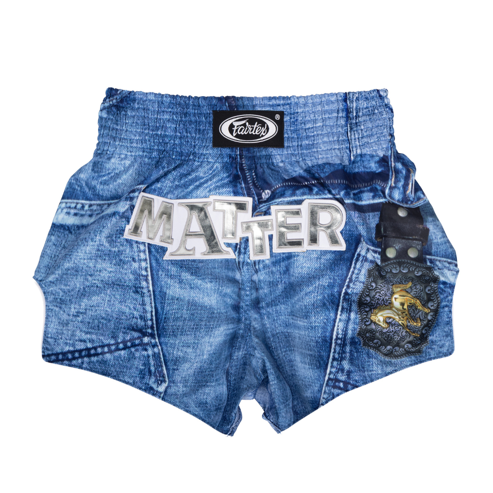 The Fairtex x MATTER MAKERS Western Denim Muay Thai Shorts blend authentic fight performance with bold streetwear design. Featuring a denim-inspired print and statement MATTER branding, this limited-edition piece brings attitude to the ring.