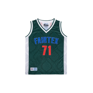 The sporty design showcases a bold Fairtex logo and number 71 on the front, while a vertical Thai flag graphic runs down the back for a unique cultural touch. Mesh side panels provide extra airflow, making this jersey ideal for workouts, casual outings, or even relaxing at the beach.